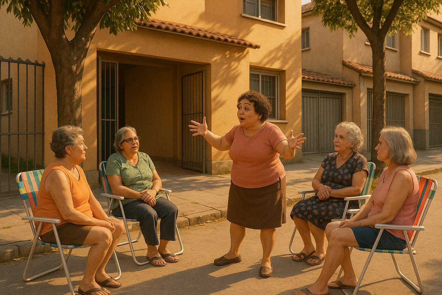 Faz do portão na sua casa um púlpito, onde junta cadeiras e se reúne com suas aprendizes, um verdadeiro confessionário, onde só ela absolve e condena os alvos da fofoca do dia.