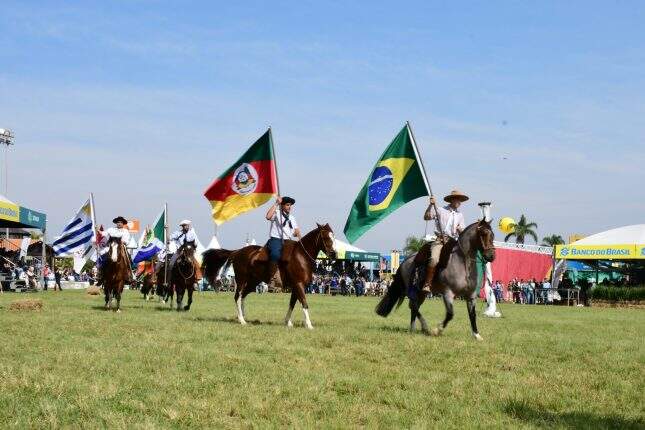 Na tradicional apresentação das bandeiras, os cavalarianos, montados nos cavalos vencedores do Freio de Ouro 2023, apresentaram os seis estandartes que representam os países e entidades que se unem em torno da Expointer. A entrada foi narrada pelo diretor administrativo do Parque de Exposições Assis Brasil, Eder Azeredo.