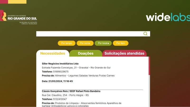 Os abrigos e as instituições dedicados a atender a população atingida pelas inundações de abril e maio no Rio Grande do Sul já começaram a receber as doações cadastradas na plataforma Solidariedade RS. A iniciativa foi desenvolvida de forma gratuita pela startup WideLabs e tem parceria do governo estadual, por meio da Sict (Secretaria de Inovação, Ciência e Tecnologia). A plataforma também está disponível no site SOS Enchentes.