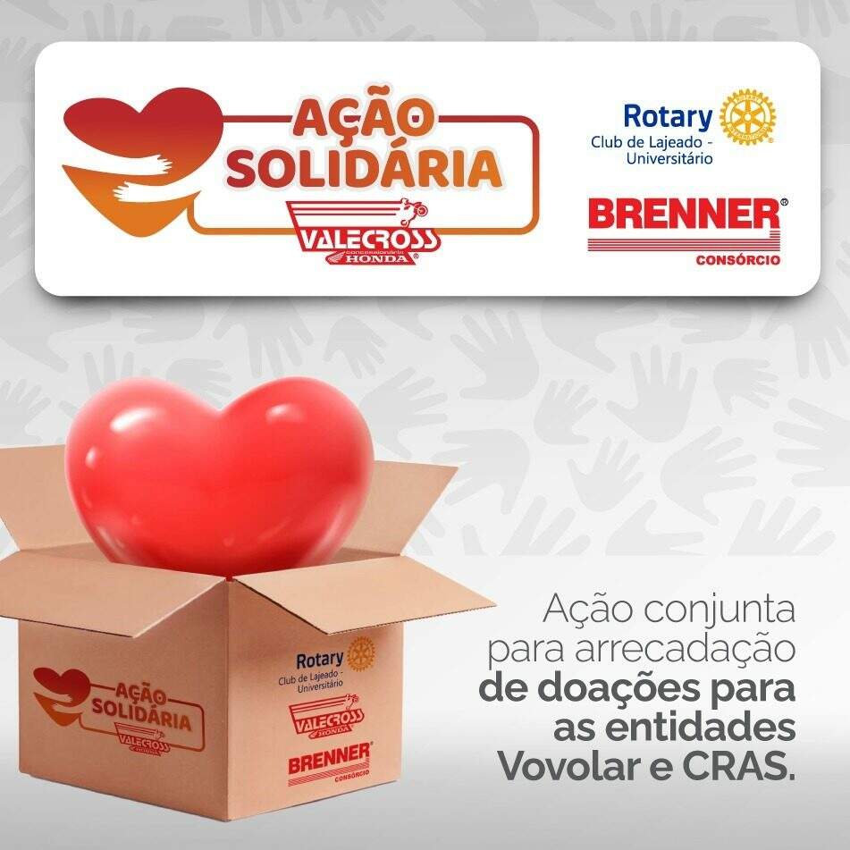 O Rotary Club Universitário de Lajeado, a Valecross e a Brenner Consórcios promovem a “Ação Voluntária Valecross”. O objetivo é arrecadar leite longa vida, alimentos não perecíveis, produtos de higiene pessoal e brinquedos em bom estado para doar às entidades Vovolar e CRAS, no município.