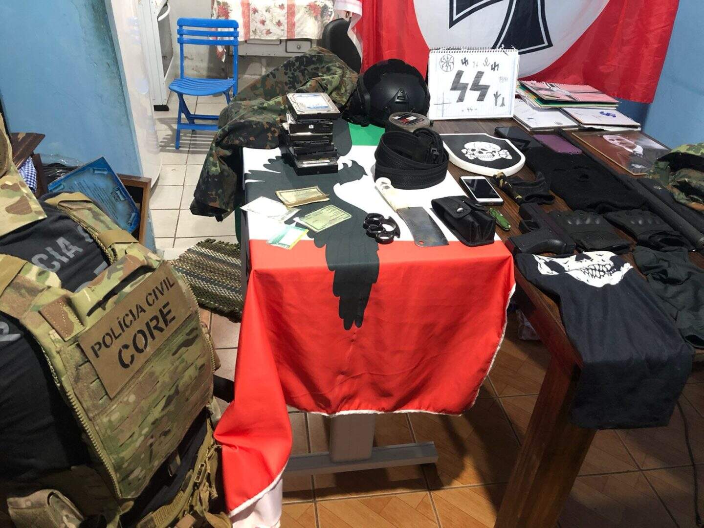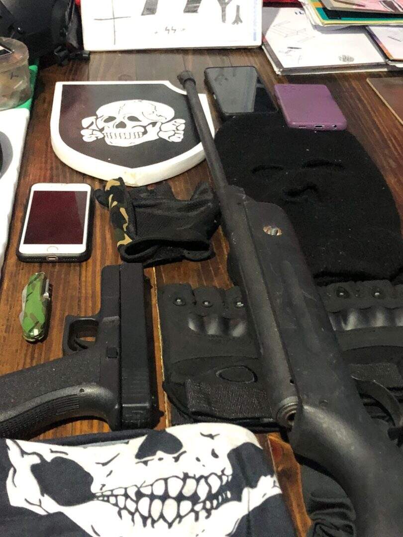Durante o cumprimento de mandado de busca e apreensão na casa onde ele mora com os pais, na noite de terça-feira (11), os policiais recolheram um simulacro de arma de fogo, facas, fardas camufladas, fotos e bandeiras nazistas e fascistas.