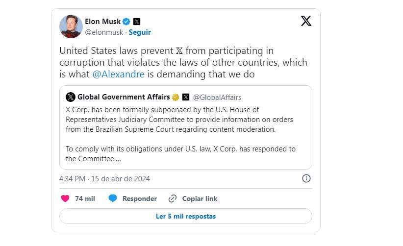 Na publicação, Musk comentava uma nota do “Assuntos Governamentais Globais”, perfil institucional do X. Nela, é dito que a X Corp., empresa privada de Musk, foi intimada pelo Comitê Judiciário da Câmara dos Deputados dos Estados Unidos para fornecer informações sobre as ordens do STF. “Para cumprir suas obrigações de acordo com a legislação dos EUA, a X Corp. respondeu ao Comitê”, informou o perfil institucional.