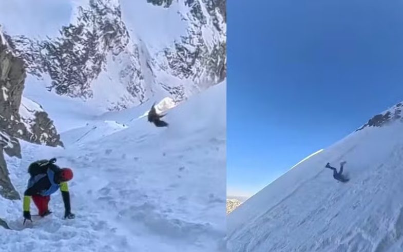 Ao escorregar, ele soltou a picareta cravada na neve e começou a deslizar rapidamente pela encosta íngreme da montanha, que alcança cerca de 2.500 metros de altitude. O vídeo mostra o momento em que o homem dá cambalhotas antes de conseguir parar alguns metros abaixo.