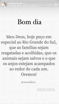 “Meu Deus, hoje peço, em especial, ao Rio Grande do Sul, que as famílias sejam resgatadas e acolhidas, que os animais sejam salvos e que os anjos estejam acampados ao redor de cada um. Oremos”, escreveu a apresentadora.