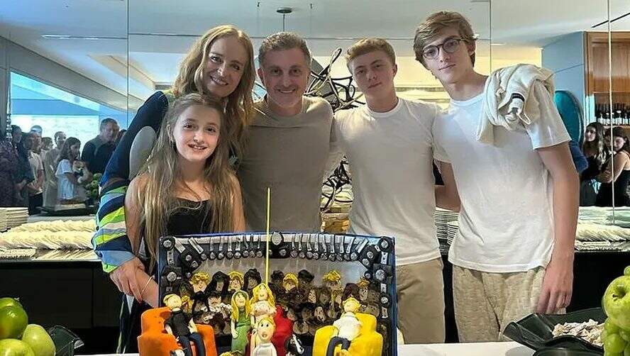 Na festinha em família, com direito a bolo personalizado, aparece, Angélica e Huck, que são casados desde 2004, e os três filhos do casal: Joaquim, de 18 anos, Benício, de 15, e Eva, de 11.