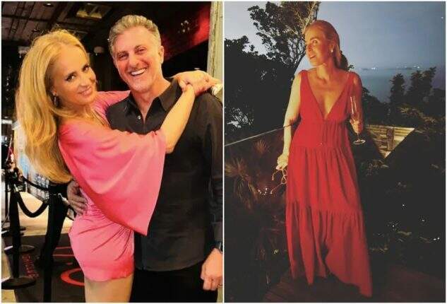 Na imagem, Angélica aparece em um vestido longo vermelho, de rosto limpo, sem maquiagem, e com uma taça na mão, enquanto posa na varanda, onde o jantar improvisado foi feito.