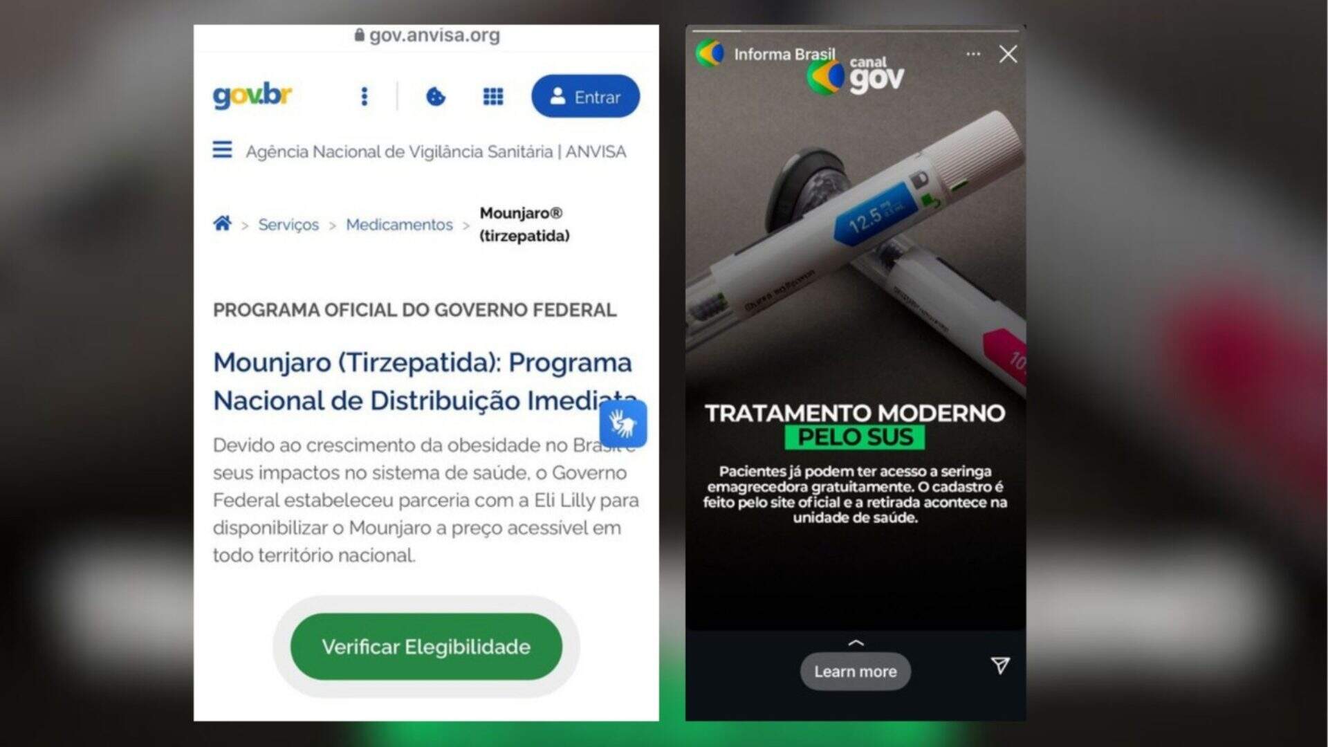 Os anúncios falam sobre uma parceria entre o governo federal e o laboratório Eli Lilly, fabricante do Mounjaro, para venda do remédio a um preço acessível, simulando o site oficial da Anvisa. Outro anúncio mostra a possibilidade de retirar seringas emagrecedoras gratuitamente em unidades de saúde, a partir de um cadastro.
