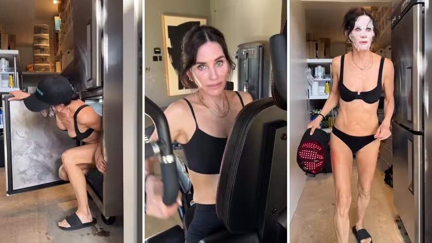 Aos 60 anos, completados em 15 de junho, Courteney Cox compartilhou os segredos para se manter em forma num vídeo publicado na internet. Eterna Monica do seriado “Friends”, a atriz mostrou o treino pesado e postou até uma imagem em que aparece saindo de um freezer. O reels do Instagram com a rotina já tem mais de seis milhões de visualizações.