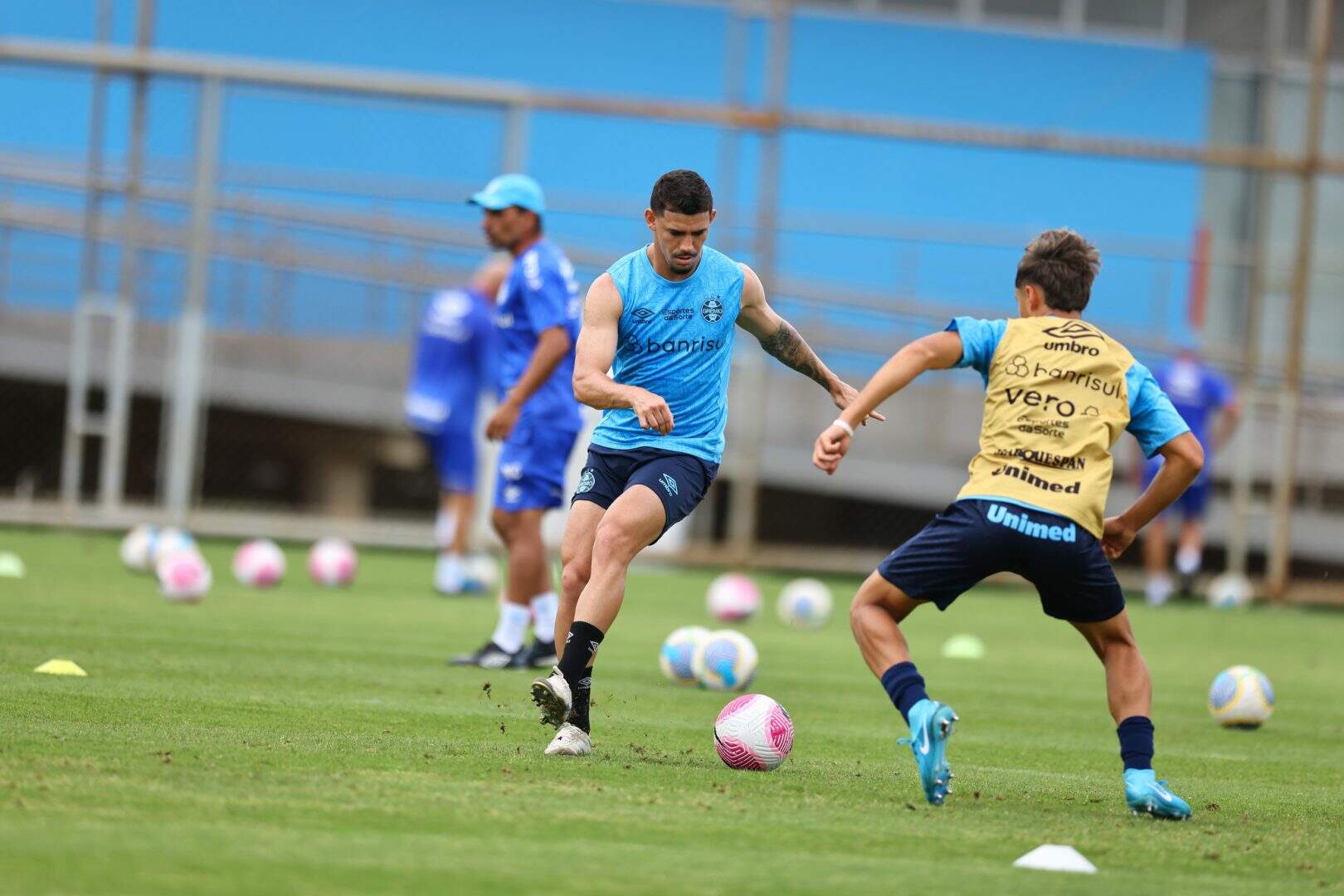 Os jogadores realizaram uma troca de passes rápida em espaço reduzido. Por orientação de Renato Portaluppi, o grupo foi dividido em duas equipes com foco na manutenção de posse de bola e evolução ofensiva até a finalização para o gol.