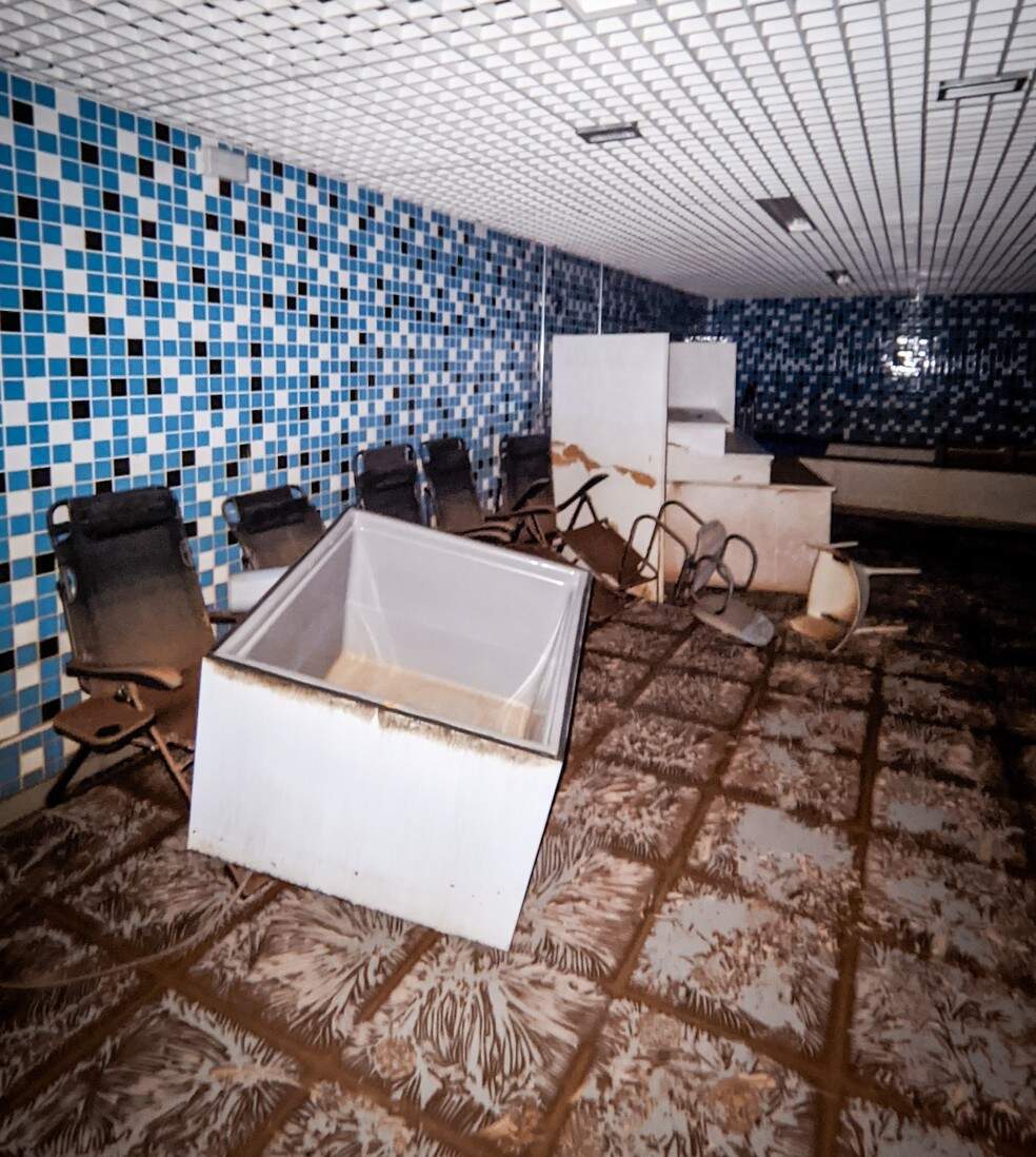 As fotos divulgadas pela Arena Porto-Alegrense mostram um peixe morto em um canto do local, além da sala de conferências, vestiários e gramado completamente tomados pelo barro após o recuo das águas.