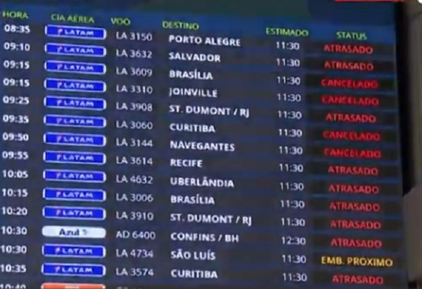 Os voos ficaram interrompidos entre as 8h58min e as 10h09min, segundo a Aena, concessionária que administra Congonhas. Dezenas de pousos e decolagens atrasaram ou foram cancelados nos dois aeroportos. Os saguões dos terminais ficaram lotados de passageiros.