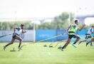 O trabalho foi divido em duas partes: física e técnica. Após o período de aquecimento, o preparador Reverson Pimentel conduziu um circuito de exercícios físicos focados no impulso e na velocidade. Em seguida, o grupo foi separado em dois times, cada um com dez jogadores. O lateral Fábio, usando um colete diferenciado, atuou como coringa para a equipe que estivesse com a posse de bola.