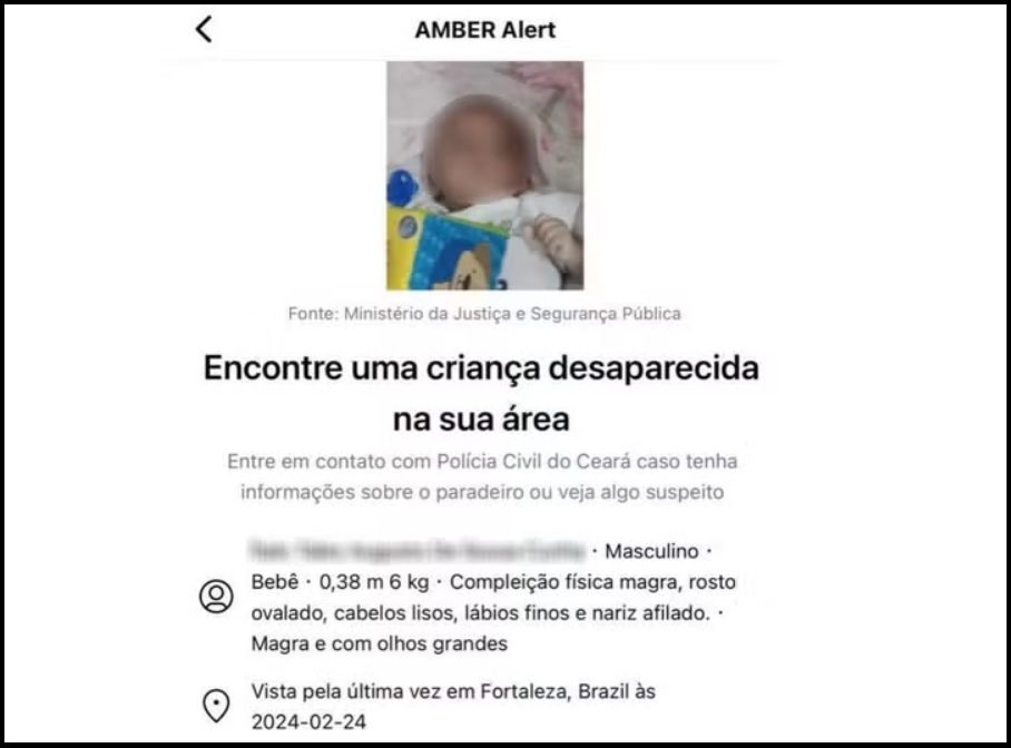 No caso do desaparecimento do bebê de dois meses em Fortaleza, a Polícia Civil do Ceará acionou o protocolo Amber Alerts junto ao Ciberlab, do Ministério da Justiça.