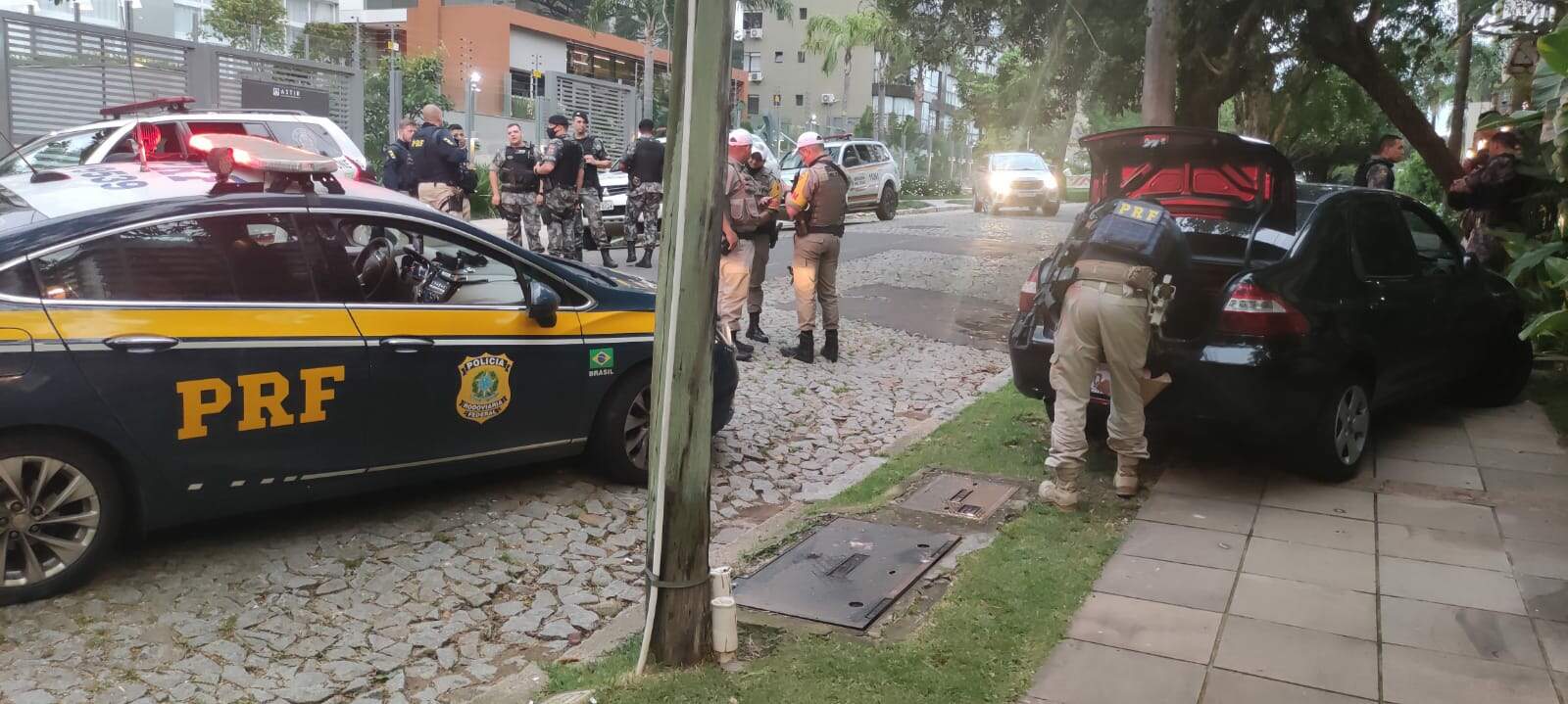 Os policiais solicitaram apoio de outras equipes da PRF e da Brigada Militar. Após colidir o carro, passar por cima de canteiros e furar sinais vermelhos, já no bairro Bela Vista, os criminosos subiram com o carro na calçada e fugiram a pé.