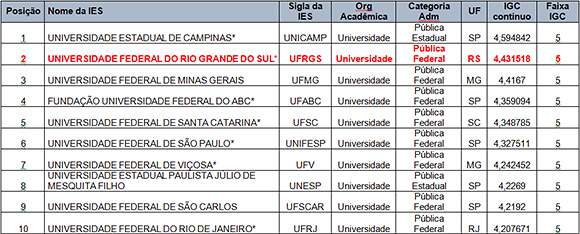 Os números do IGC (Índice Geral de Cursos) haviam sido divulgados no dia 2 deste mês. No entanto, novos cálculos apontaram que, em vez de um crescimento de 1,2% no IGC contínuo, a UFRGS obteve um avanço de 1,9%, consolidando-se como a melhor universidade federal do País – sendo superada, no ranking geral nacional, apenas pela Universidade Estadual de Campinas, em São Paulo.