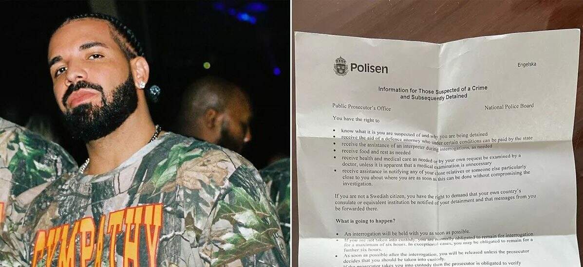 Após negar rumores de que tinha sido detido em sua passagem pela Suécia, Drake voltou atrás e revelou que, de fato, isso aconteceu. No Instagram, ele postou um álbum de fotos de sua viagem e em um dos cards é possível ver um folheto que detalha seus direitos no país europeu como uma pessoa presa.
