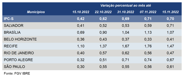Além de Porto Alegre, o IPC-S caiu em outras três das sete capitais pesquisadas pela FGV na segunda semana de novembro.