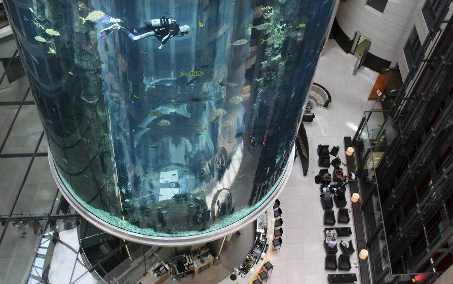 O AquaDom de Berlim, o maior aquário cilíndrico privado do mundo, explodiu na manhã nesta sexta-feira. Duas pessoas ficaram feridas com estilhaços de vidro no hotel Radisson Blu, onde fica o aquário. Nos vídeos que circulam na web, é possível ver o tanque com capacidade para comportar 1 milhão de litros de água vazio, água jorrando pelo salão e detritos espalhados por toda parte.