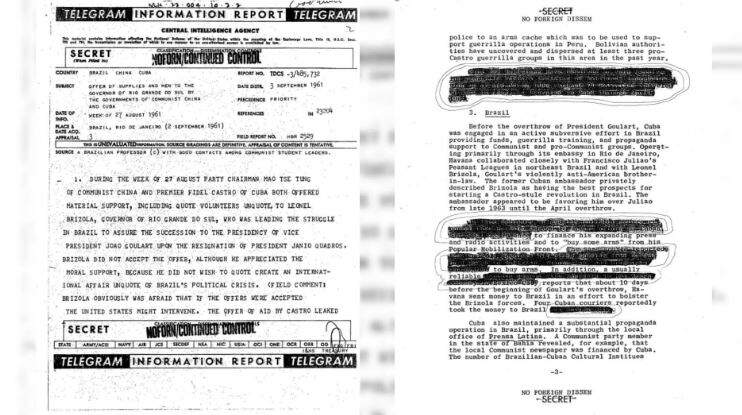 Segundo um dos arquivos, datado de 1961, Mao Tsé-Tung, então líder do Partido Comunista da China, e Fidel Castro, então primeiro-ministro de Cuba, ofereceram “materiais, “suporte” e “voluntários” para Leonel Brizola, então governador do Rio Grande do Sul, em agosto daquele ano.