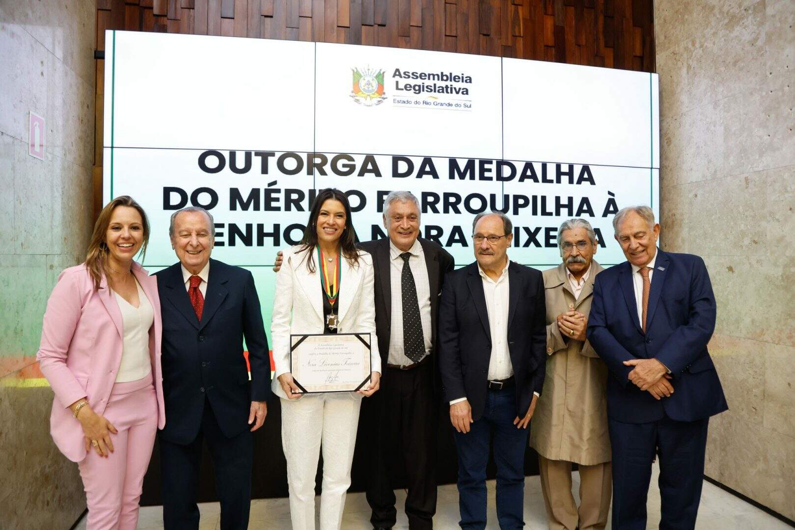 O presidente da Assembleia Legislativa gaúcha, deputado Adolfo Brito (PP), entregou a Medalha do Mérito Farroupilha à advogada e empresária Nora Livonius Teixeira. A Medalha do Mérito Farroupilha é a distinção máxima da Assembleia Legislativa, destinada a pessoas que contribuíram para o desenvolvimento econômico, social e cultural do estado.