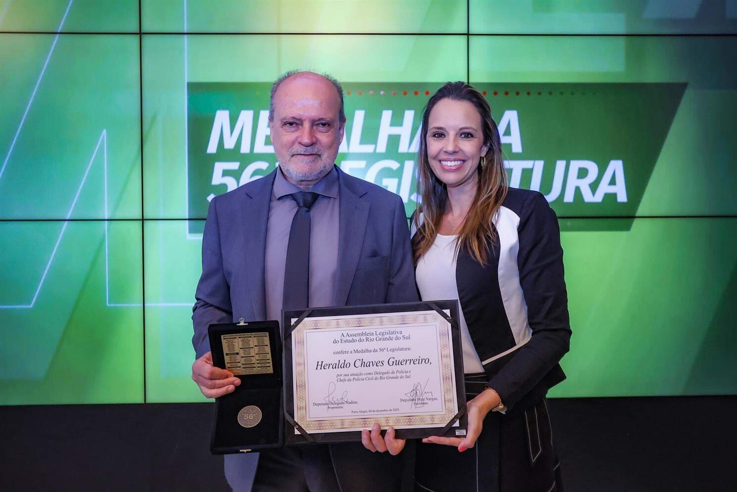 O Chefe da Polícia Civil do Rio Grande do Sul, delegado Heraldo Guerreiro, recebeu na quinta-feira (04) a Medalha da 56ª Legislatura da Assembleia Legislativa. A homenagem foi proposta pela deputada Delegada Nadine (PSDB).