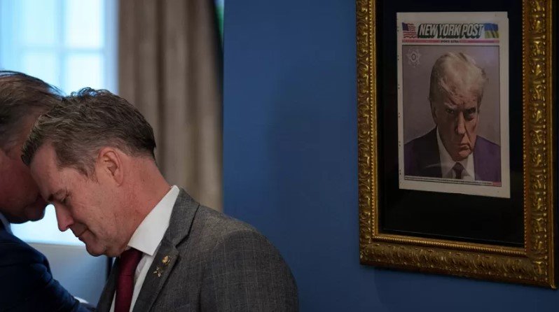Um assessor do presidente dos EUA, Donald Trump, postou um vídeo onde mostra que o republicano pendurou a sua própria “mugshot”, ou foto da ficha criminal, na Casa Branca. O quadro dourado com a foto capa do jornal “New York Post” aparece na entrada do Salão Oval, reforçando sua estratégia de transformar o episódio em símbolo de campanha.