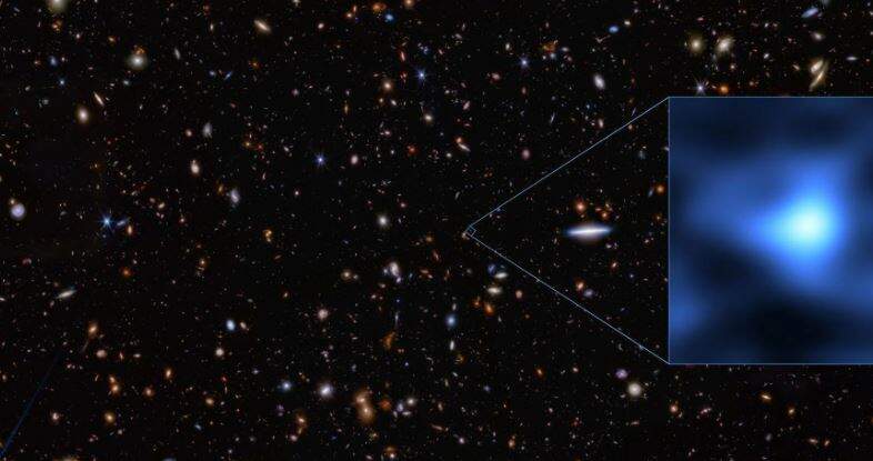 A luz do JADES-GS-z14-0 levou 13,4 bilhões de anos para chegar ao nosso canto do universo, então Webb e outros observatórios como o Alma, ou o Atacama Large Millimeter/submillimeter Array no Deserto do Atacama, no Chile, estão vendo a galáxia como ela era quando o universo tinha apenas cerca de 300 milhões de anos.