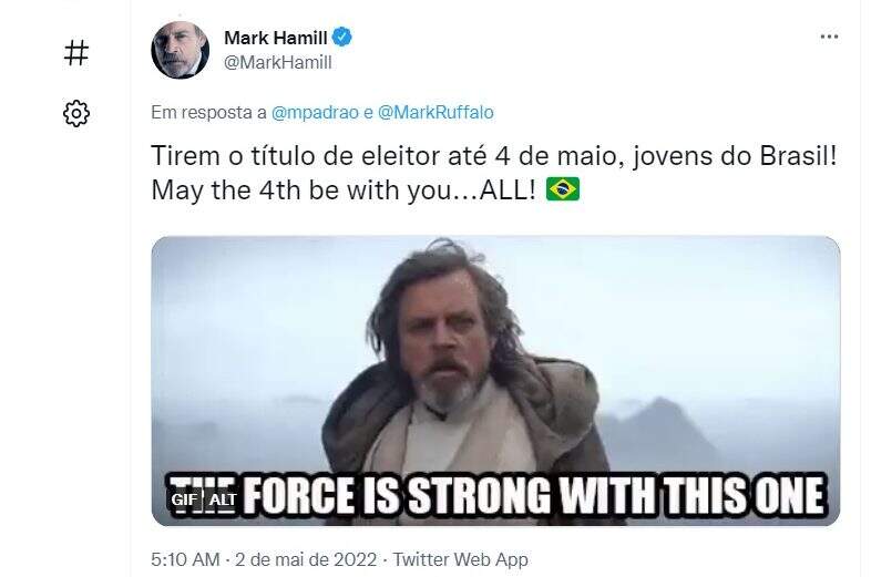 Hamill aproveitou a deixa do colega e respondeu à publicação: “Tirem o título de eleitor até 4 de maio, jovens do Brasil! May the 4th be with you…ALL!”, escreveu.