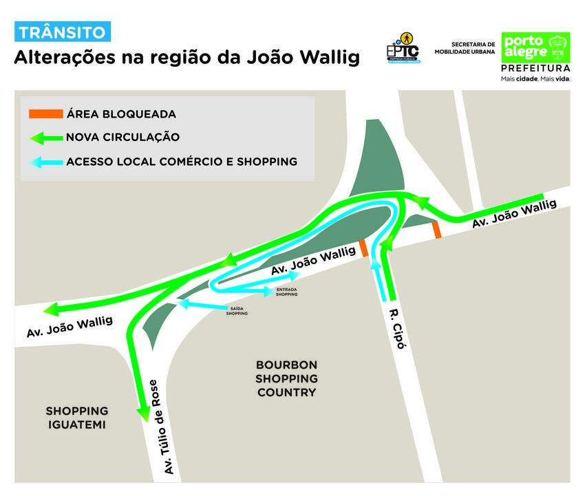 Os motoristas que passarem pelo local deverão usar a pista nova, construída à direita. Os acessos (entrada e saída) ao Shopping Bourbon Country terão de ser feitos através de recorte no canteiro. O acesso aos estabelecimentos comerciais do lado esquerdo da João Wallig no trecho bloqueado será por meio de acesso local.