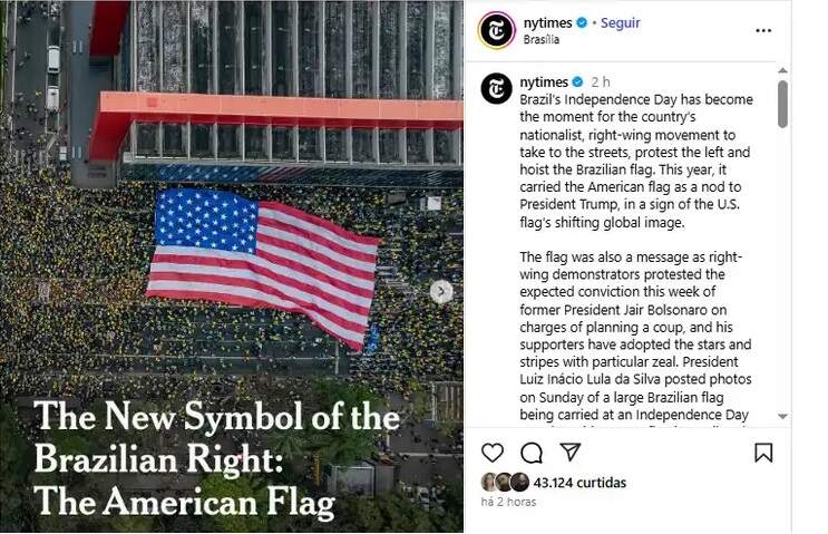 “O Dia da Independência do Brasil tornou-se o momento para o movimento nacionalista de direita do país ir às ruas, protestar contra a esquerda e hastear a bandeira brasileira. Este ano, a bandeira americana foi hasteada como uma homenagem ao presidente Trump, um sinal da mudança na imagem global da bandeira americana”, diz a postagem do NYT.