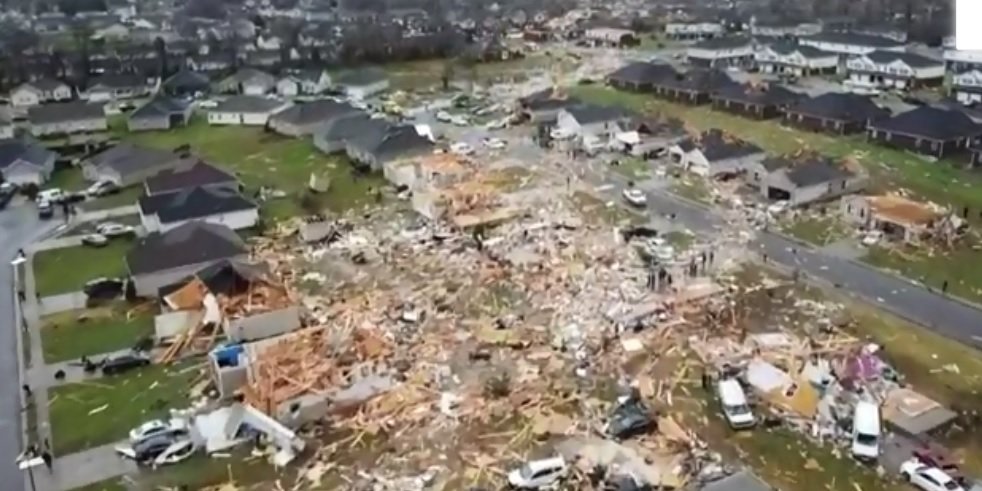 Cerca de 53.000 de seus concidadãos, de acordo com o Poweroutrage.us, passaram o fim de semana inteiro sem energia depois que a rede de energia foi seriamente danificada. Um dos tornados desfilou em sua silhueta escura por quase 400 quilômetros e devastou o centro de Mayfield, a igreja, o tribunal, a loja de pneus e dezenas de casas.