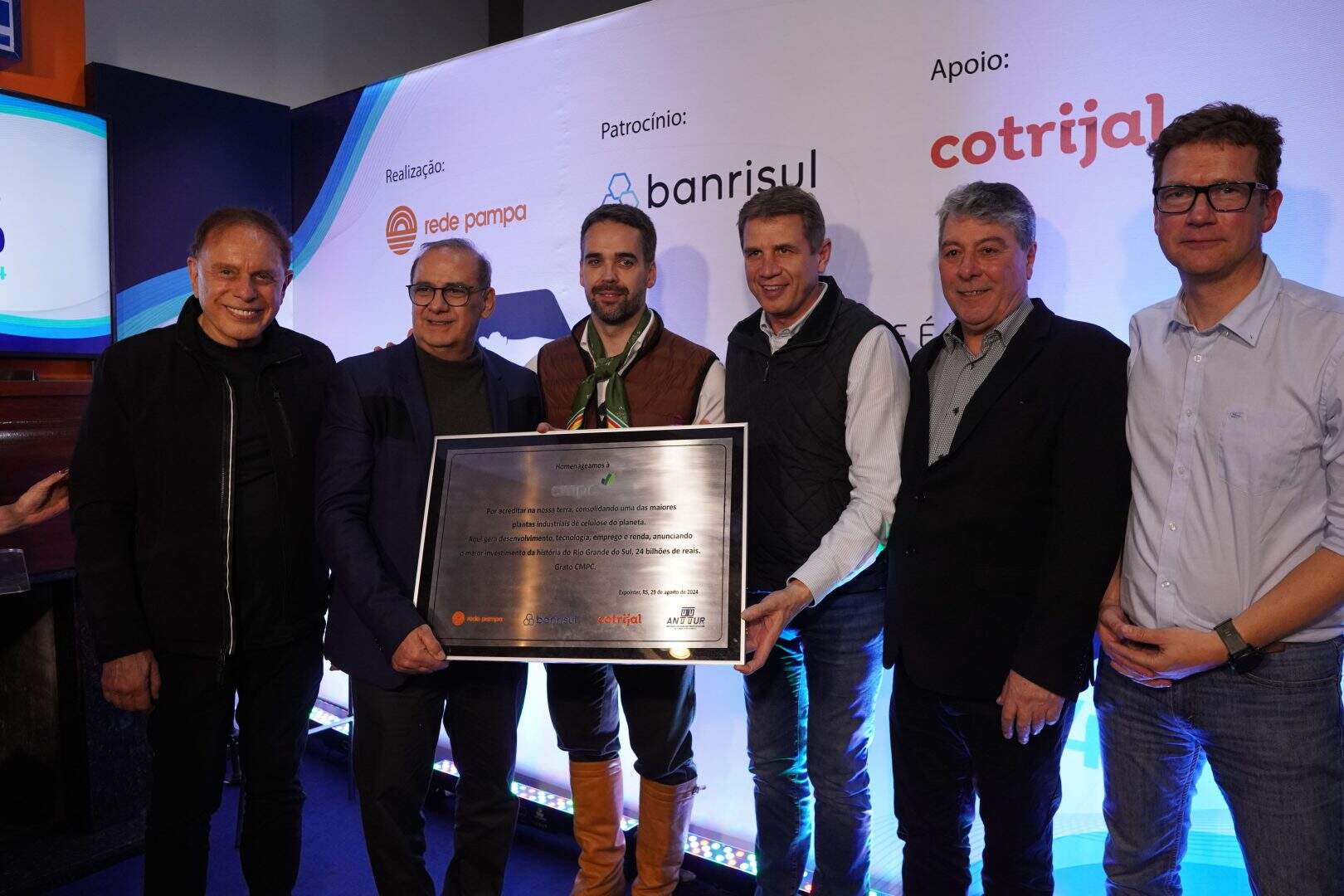 Das mãos do governador Eduardo Leite, do presidente do Banrisul, Fernando Lemos, e do fundador da Rede Pampa, Otavio Gadret, foi entregue uma premiação extra na cerimônia deste ano. Uma placa em reconhecimento pelo investimento de R$ 24 bilhões no Estado, o maior da história do Rio Grande do Sul, aos diretores da CMPC, Antonio Lacerda e Augusto Robert.