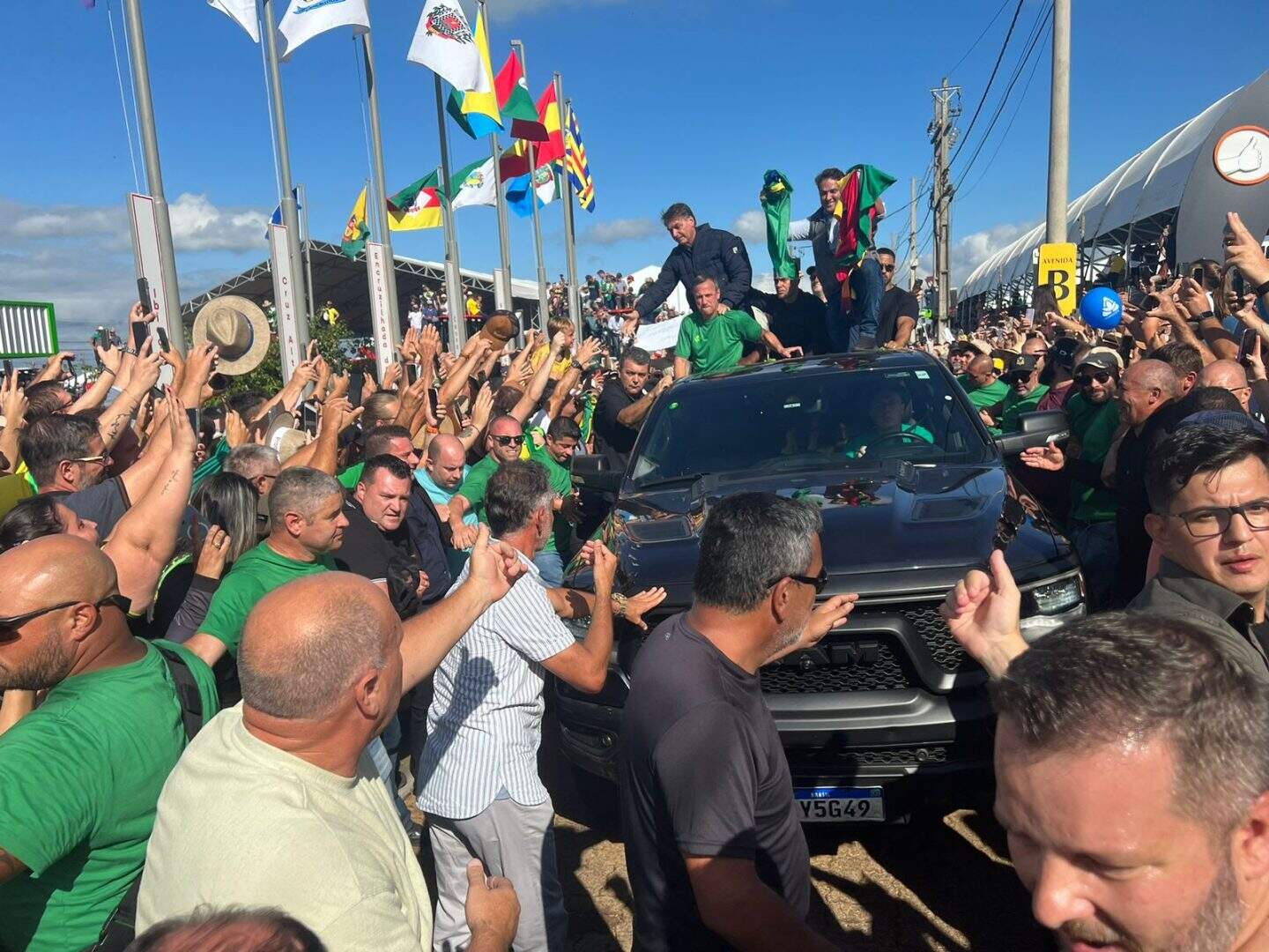 Já na Expodireto, o público lotava o espaço à espera do ex-chefe do Executivo. Bolsonaro foi recebido pelo presidente da Cotrijal Nei Cesar Manica e depois seguiu para o pavilhão da Agricultura Familiar. Todo o trajeto foi feito por Bolsonaro na carroceria de uma caminhonete, cercado por seguranças e acompanhado pelos deputados federais Tenente-Coronel Zucco (PL), Sanderson (PL) e Osmar Terra (MDB).