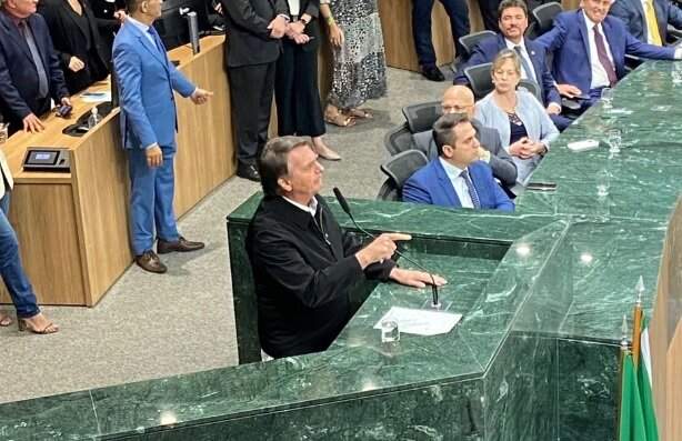 O ex-presidente Jair Bolsonaro (PL) recebeu, nessa sexta-feira (18), o título de cidadão goiano na Assembleia Legislativa de Goiás (Alego), em Goiânia. Antes da cerimônia, Bolsonaro visitou uma joalheria, onde ganhou uma semijoia da dona e brincou dizendo que a última vez que ele ganhou um presente do tipo “deu o maior problema”.