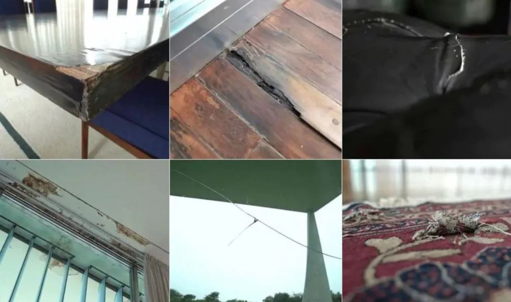 No espaço onde geralmente a presidência recebe visitas, Janja revelou danos em tapetes, estofados dos sofás rasgados, paredes com infiltração profunda, janelas com vidros quebrados e obras de arte sacra dispostas no chão do salão e esculturas e quadros que deveriam estar lá, mas não estão.