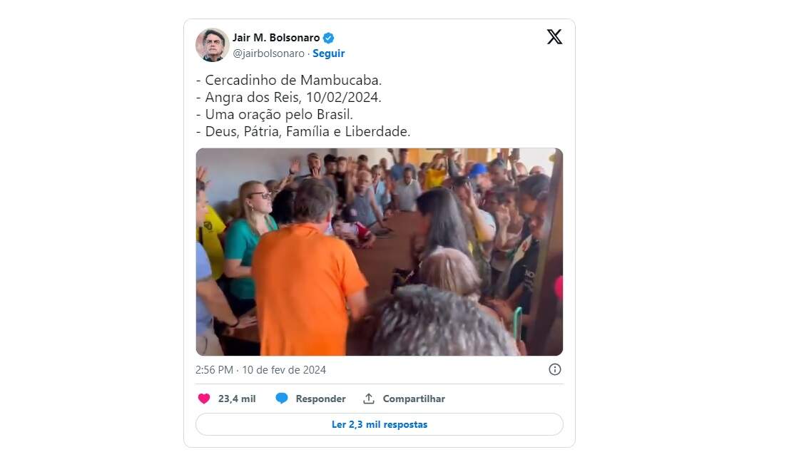 O ex-presidente Jair Bolsonaro (PL) postou nas suas redes sociais um vídeo rezando com apoiadores dois dias após se tornar alvo da Operação Tempus Veritatis da Polícia Federal (PF), que investiga o planejamento de um golpe de Estado por ele e seus apoiadores após a derrota nas eleições de 2022. Na legenda da postagem, feita em sua casa de veraneio em Angra dos Reis (RJ), o ex-presidente diz a oração é “pelo Brasil”.