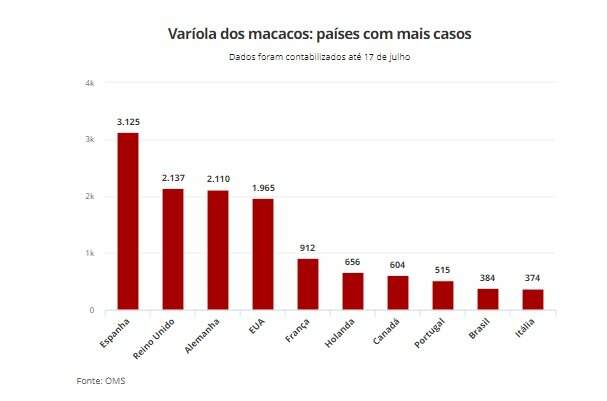 O Brasil está entre os que têm mais casos confirmados: até o dia 17 de julho, 384 casos haviam sido notificados à OMS. Já o Ministério da Saúde contabilizava, até esta quinta (21), 592 registros da infecção.