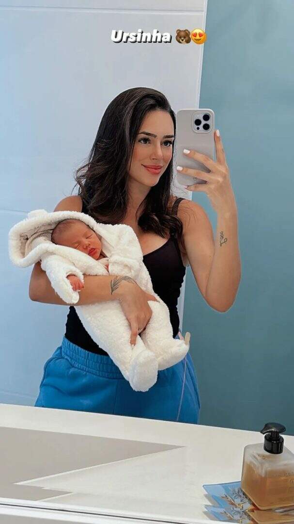 Bruna Biancardi compartilhou em seus stories neste sábado (14) um novo clique ao lado de Mavie, sua filha com o jogador de futebol Neymar. “Ursinha”, disse, se referindo ao macacão fofo usado pela bebê, todo em pelúcia e com capuz.