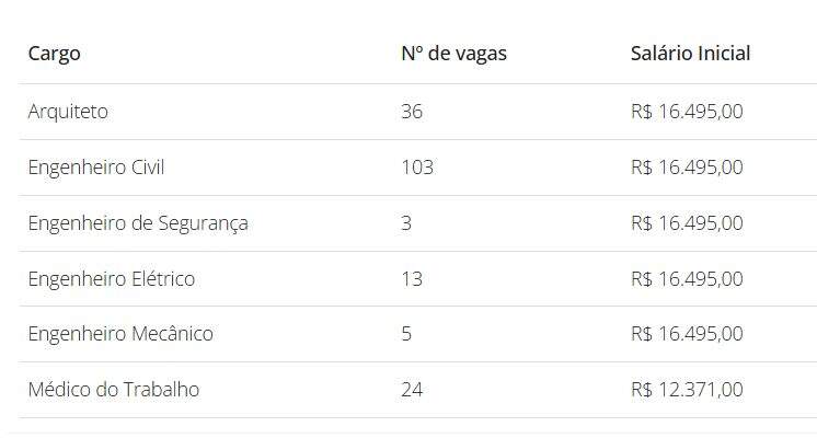 A maior parte das vagas é para engenheiros civis, mas também há oportunidades para arquitetos, engenheiros de segurança, engenheiros elétricos, engenheiros mecânicos e médicos do trabalho. Os salários variam de R$ 12.371 a R$ 16.495.