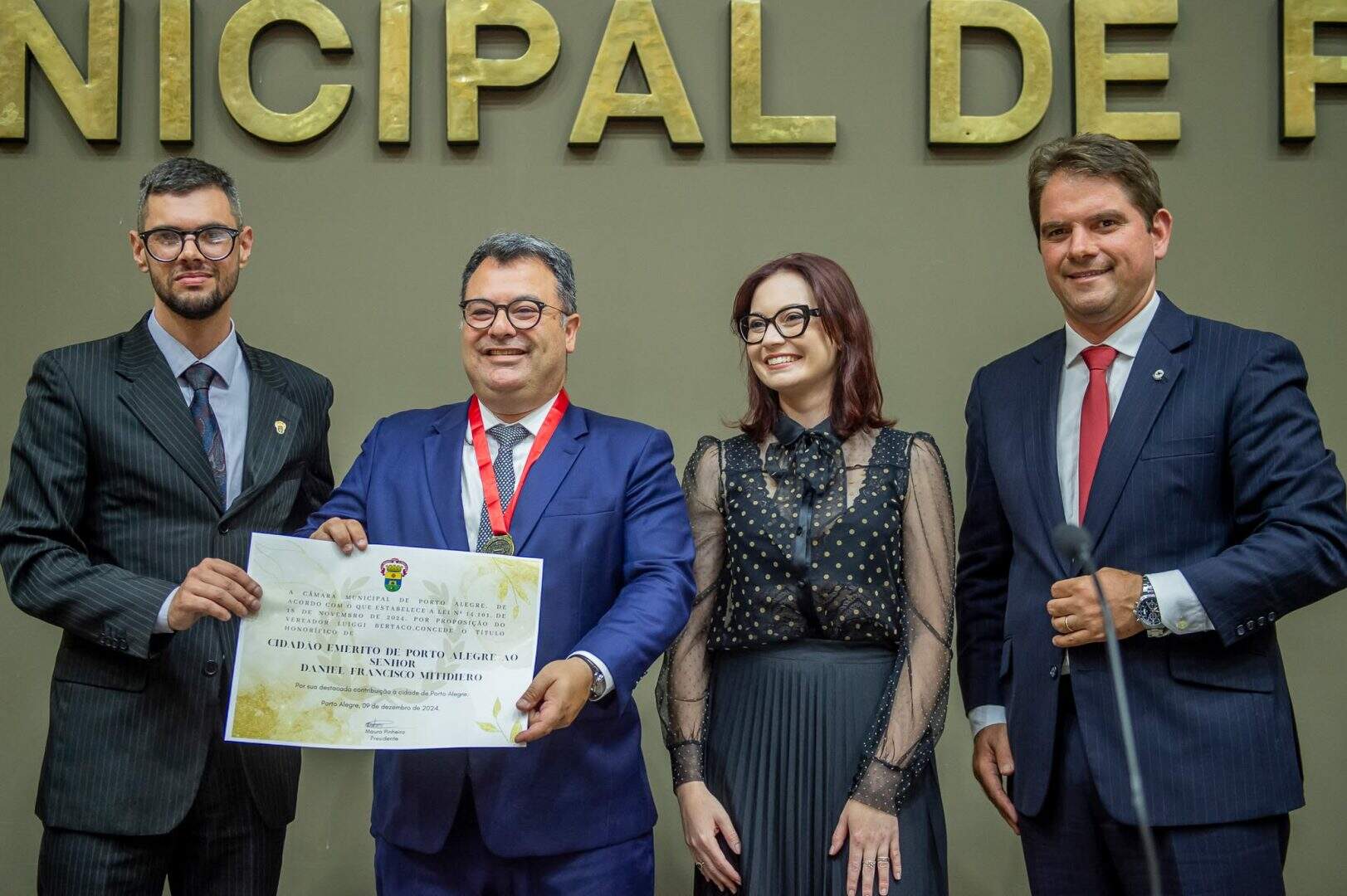 Em sessão solene na segunda-feira (9), a Câmara Municipal entregou o título de Cidadão de Porto Alegre ao advogado, escritor e professor de Direito da Ufrgs Daniel Mitidiero. A distinção foi proposta pelo vereador suplente Luiggi Bertaco (PDT). A sessão foi presidida pelo vereador Márcio Bins Ely.