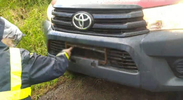 Durante operação de fiscalização, os policiais abordaram uma Hilux emplacada na Argentina. Ao vistoriarem o veículo os agentes perceberam que a placa dianteira da caminhonete, que seguia para o litoral, estava demasiadamente solta.