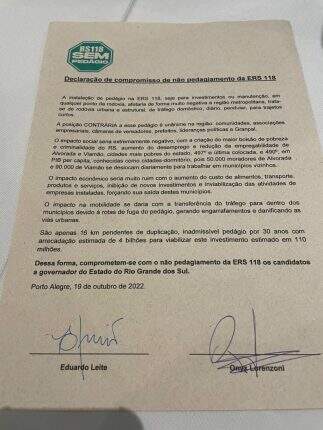 Durante encontro na Federasul (Federação de Entidades Empresariais do Rio Grande Sul) na manhã desta quarta-feira (19), os candidatos ao governo gaúcho Onyx Lorenzoni (PL) e Eduardo Leite (PSDB) assumiram o compromisso do não pedagiamento da ERS-118.