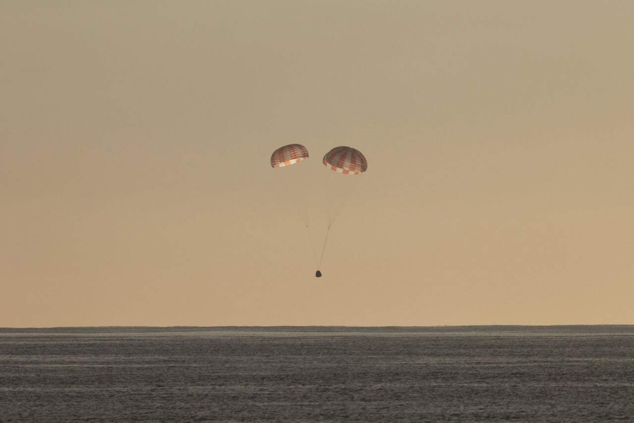 A cápsula SpaceX Crew Dragon, apelidada de Freedom, transportando três astronautas norte-americanos da Nasa e uma colega de tripulação italiana, da Agência Espacial Europeia, caiu de paraquedas no mar, concluindo um voo autônomo de cinco horas da ISS para casa.
