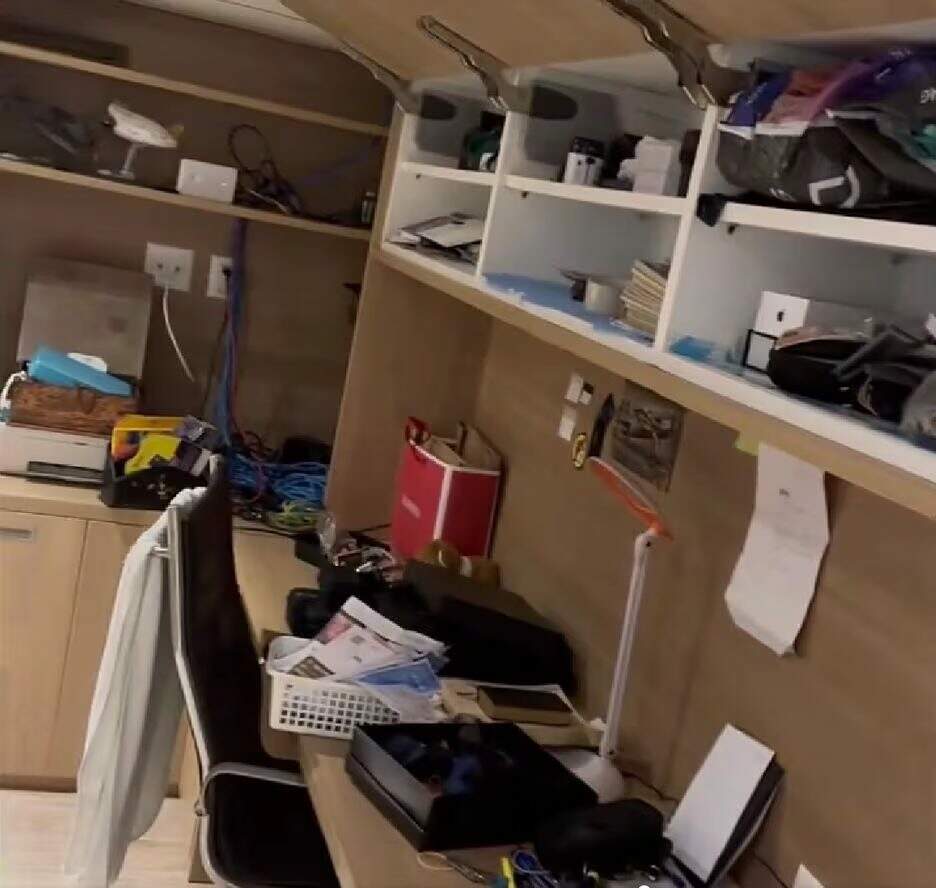Nas imagens, é possível ver um cômodo onde móveis estão com portas e gavetas abertas e também vários itens em cima do aparador e do sofá, como cabos, caixas de equipamentos eletrônicos e outros objetos.