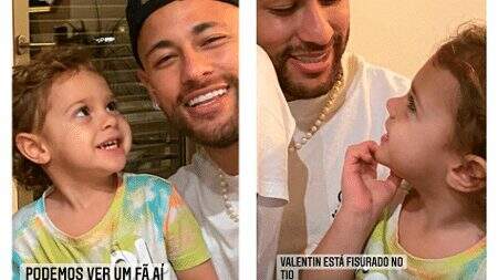 “Podemos ver um fã aí”, disse ela em foto em que Valentin aparece no colo de Neymar. Em outro clique, ela brincou: “Fissurado no tio”.