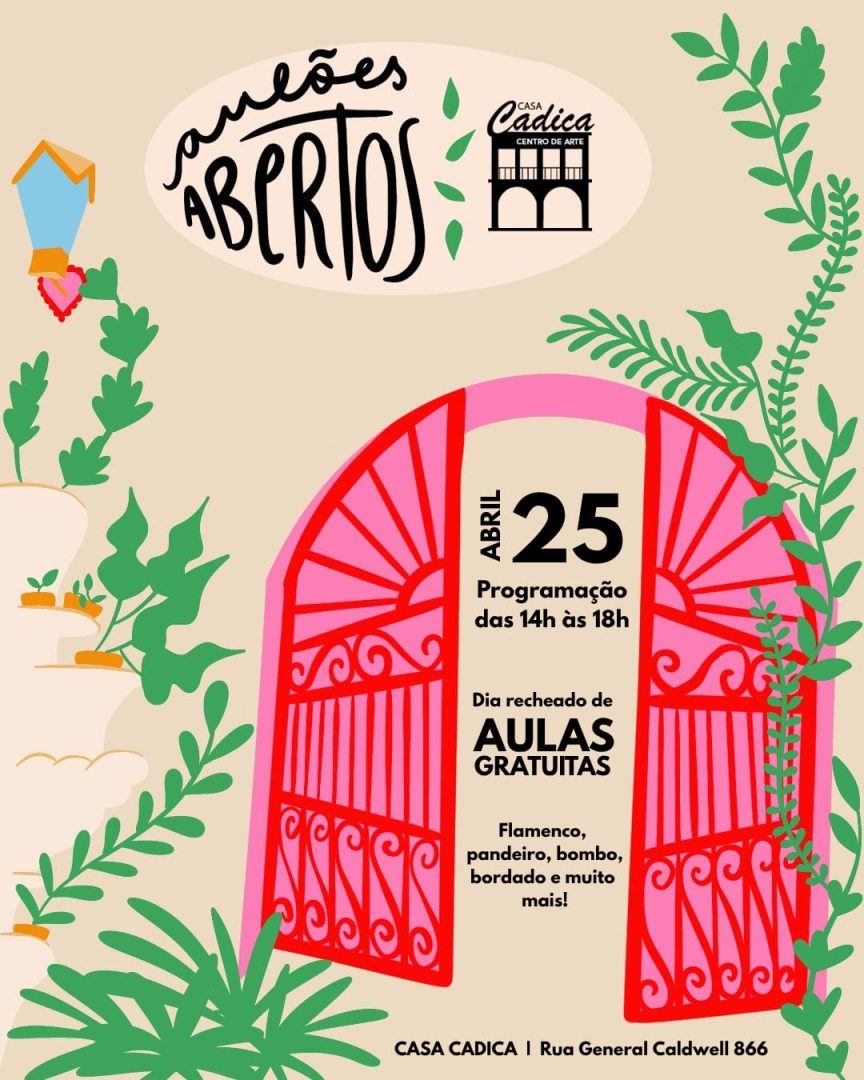 A Casa Cadica Centro de Arte realizará no próximo dia 25/04 o projeto “Portões Abertos”, oferecendo ao público, no turno da tarde, de forma gratuita, uma imersão gratuita em diferentes linguagens artísticas.