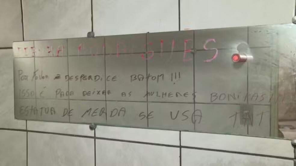 Em um espelho no banheiro da casa foi escrito com batom o nome de Débora Rodrigues, mulher que pichou a estátua da Justiça durante os ataques do dia 8 de janeiro de 2023. “Por favor, não desperdice batom! Isso é para deixar as mulheres bonitas. Estátua de merda se usa TNT”, diz a mensagem.