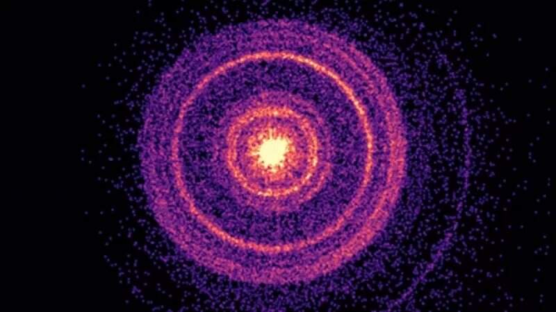A explosão de raios gama (também conhecida pela sigla GRB) ocorreu a dois bilhões de anos-luz da Terra e iluminou grande parte da galáxia. Imagens do raro e poderoso fenômeno cósmico mostram formas semelhantes a um halo (um círculo luminoso) e um “alvo”.