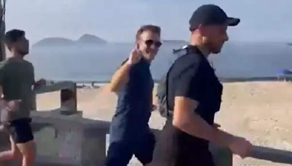 Simpático, Macron sorriu e acenou para a câmera de Théo, mas continuou sua atividade física ao ar livre, cercado por seguranças. O presidente francês já havia corrido, pelo menos, 3 quilômetros por volta das 7h.