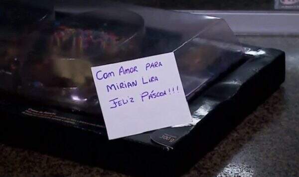 A família recebeu o ovo de Páscoa na noite de quarta-feira (16), por meio de um motoboy, como se fosse um presente. Com o ovo, havia um bilhete com a mensagem: “Com amor, para Mirian Lira. Feliz Páscoa”.